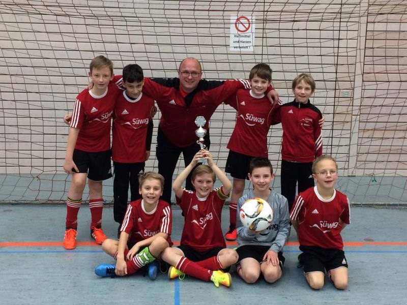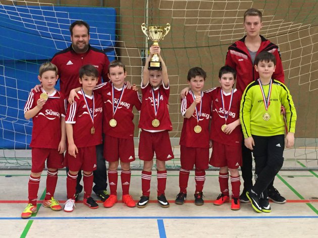 Das erste Hallenturnier im neuen Jahr führte die 2007er E-Jugend nach Flein. Bei winterlicher Anreise erschienen alle Spielerinnen und Spieler pünktlich zum frühen Treffpunkt (8:15 Uhr). Einer guten Vorbereitung stand also nichts mehr im Weg. Wir spielten mit zwei Mannschaftsblöcken (jeweils 4 Feldspieler), die dann zur Hälfte der Spielzeit getauscht wurden. Im Eröffnungsspiel des Turniers trafen wir gleich auf den Gastgeber aus Flein. Von Beginn an konnten wir uns ein Übergewicht an Spielanteilen erarbeiten und boten eine tolle und konzentrierte Vorstellung. Die Defensive um unseren Torwart Niklas und Abwehrchef Robin stand sicher und lies keine Chancen zu. Die Mittelfeldspieler Luis und Lina mit unserem Stürmer Maik lieferten einen beherzten Einsatz und setzten sich dem Gegner klasse zur Wehr. Leider konnten wir diese Überlegenheit nicht in Tore ummünzen. Dies gelang auch dem zweiten Block nicht. Beide Mannschaftsteile spielten sehr ausgeglichen und konzentriert, so dass das Spiel mit 0:0 endete. Die beiden folgenden Partien gegen Besigheim und Lehrensteinsfeld gingen jeweils mit 0:3 verloren. In diesen Partien machte sich stark bemerkbar, dass beim Gegner auch Spieler des älteren Jahrgangs (2006) eingesetzt wurden. Hier waren wir letztendlich chancenlos, aber trotzdem nicht haushoch unterlegen. In der letzten Partie trafen wir auf Massenbachhausen. In dieser Partie ging es um den dritten Platz in der Vorrundentabelle. Ein Weiterkommen war zu diesem Zeitpunkt nicht mehr möglich. Wir gingen sehr selbstbewusst ins Spiel und erzielten prompt durch einen abgefälschten Eckball von Luis das 1:0. Massenbachhausen gab natürlich nicht auf und erzielte schnell das 1:1. Nach dem Wechsel auf unseren zweiten Block, um unseren Kapitän Marius und den Mittelfeldspielern Lukas und Philipp, spielten wir weiter sicher nach vorne. Linus im Sturm attackierte den Gegner immer wieder frühzeitig, so dass wir den nötigen Druck aufbauen konnten. Nach einer wunderschönen Kombination im Mittelfeld zwischen Linus und Philipp schloss dieser platziert in die untere linke Ecke zum umjubelten 2:1 ab. Danach spielten wir die Partie clever zu Ende und ließen dem Gegner keine Chance mehr. Dieser Sieg war ein gelungener Abschluss unseres ersten Hallenturniers im Jahr 2017.